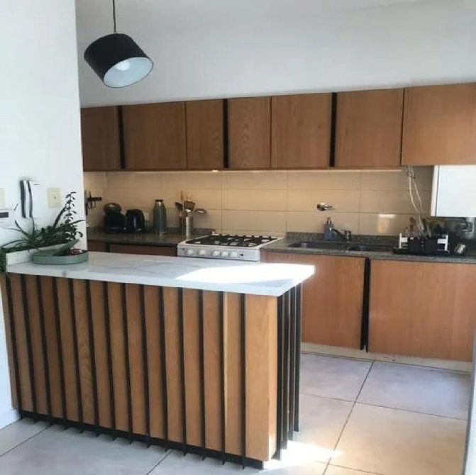 Cocina con pisos de porcelanato, alacenas, bajo mesada y barra desayunadora.